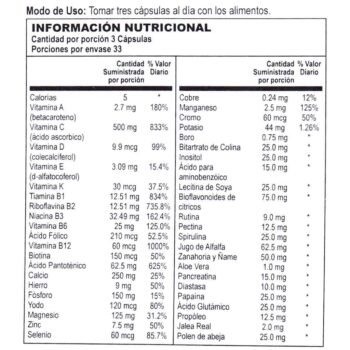 Suplemento de origen natural que contiene vitaminas y minerales, antioxidantes, carotenoides y concentrados vegetales.