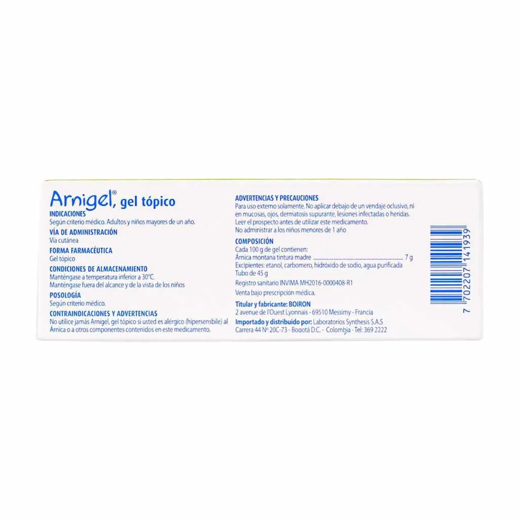 | Advertencias y/o contraindicaciones: | Es un medicamento homeopático. No exceder su consumo. No utilice jamás Arnigel, gel tópico si usted es alérgico (hipersensible) al árnica o a otros componentes contenidos en este medicamento. Para uso externo solamente. No aplicar debajo de un vendaje oclusivo, ni en mucosas, ojos, dermatosis supurante, lesiones infectadas o heridas. Si los síntomas persisten consultar al médico. No administrar a los niños menores de 1 año. |