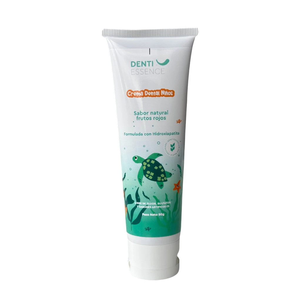 Crema dental para niños sin flúor Dentiessence es elaborada a partir ingredientes naturales. El sabor de DENTI ESSENCE es completamente natural, polvo secado por aspersión de una mezcla de pulpas de frutos rojos: fresa, mora y cereza, sumado a un toque de Aceite Esencial de menta arvensis que brinda una suave sensación de frescura.
