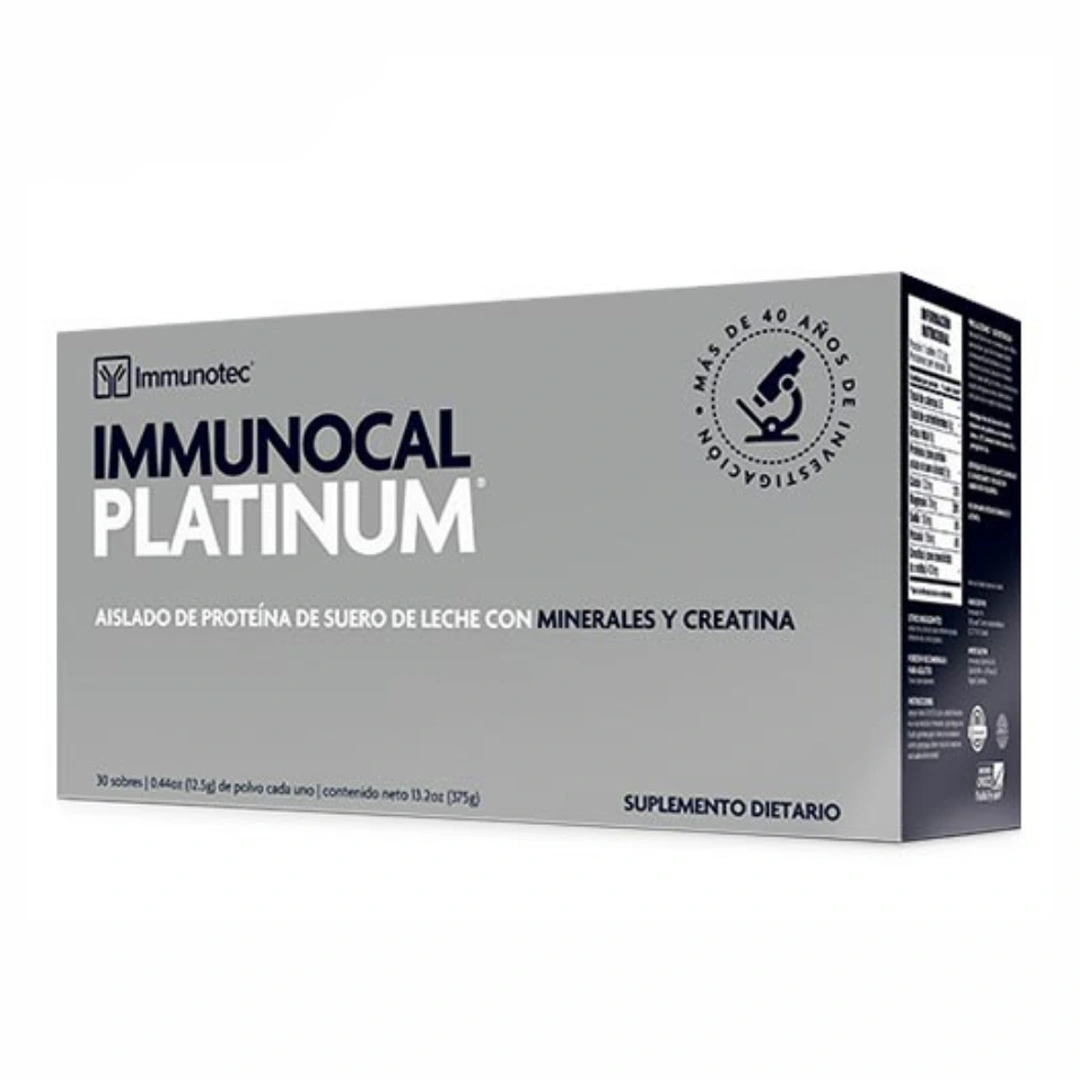 | Advertencias y/o indicaciones: | Inmunocal platinum no es recomendado para individuos que desarrollan o que sufren de hipersensibilida a proteínas especificas de la leche (esto no incluye la intolerancia a la lactosa). Cada sobre de inmunocal platinum proporciona 9g de proteínas y los individuos bajo una dieta restringida en proteínas debe tomarlo en cuenta para calcular su ingestión diario de proteínas. Manténgase fuera del alcance de los niños. No consumir en estado de embarazo o lactancia. |