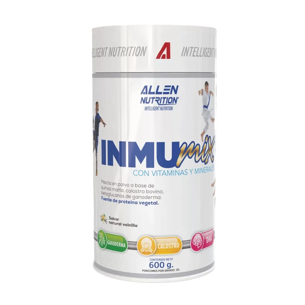 Inmumix, único complemento nutricional para niños en Colombia avalada por AMEDCO (Asociación de Medicina del Deporte de Colombia). Mezcla en polvo a base de quinoa, malta, calostro bovino, betaglucanos de ganoderma, vitaminas y minerales. Sabor natural a vainilla. Endulzado con stevia.
